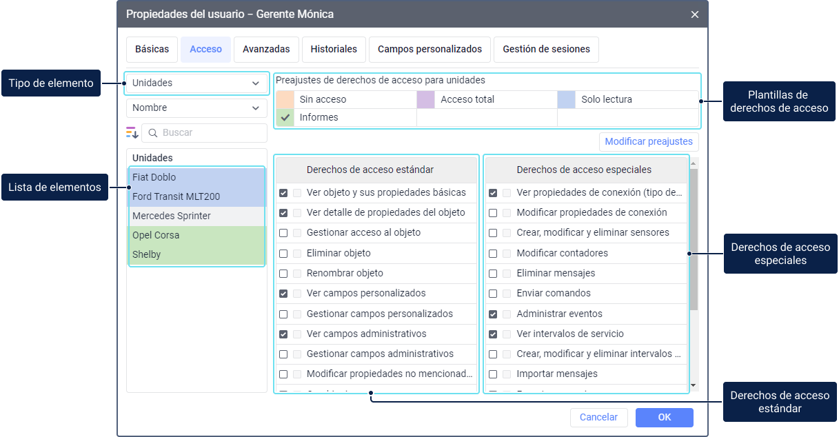 En la parte derecha se muestran los derechos de acceso a los objetos que pueden ser concedidos al usuario. Los derechos están divididos en dos tipos: estándar y especiales (que dependen del tipo escogido de objetos, por ejemplo, derechos de acceso a unidades).