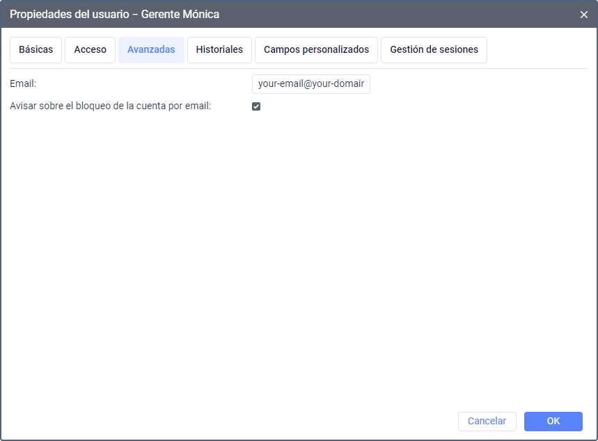 En la pestaña Avanzadas puede indicar el correo electrónico al que el usuario debe recibir los mensajes del administrador del servicio.