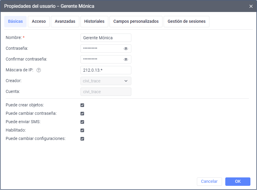 En esta pestaña puede indicar las propiedades básicas del usuario y escoger qué acciones deben ser disponibles para él.