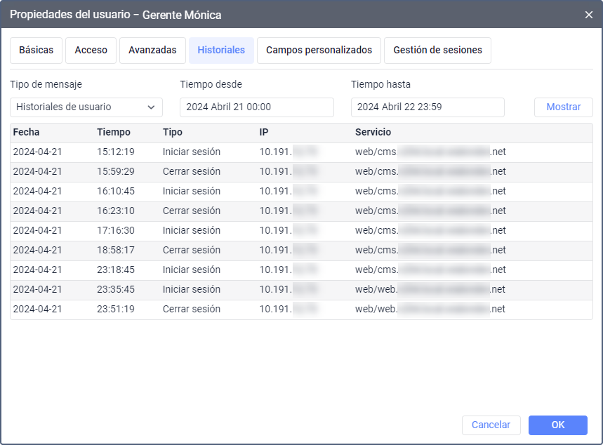 - dirección IP del dispositivo desde el cual se ha iniciado o se ha finalizado sesión: