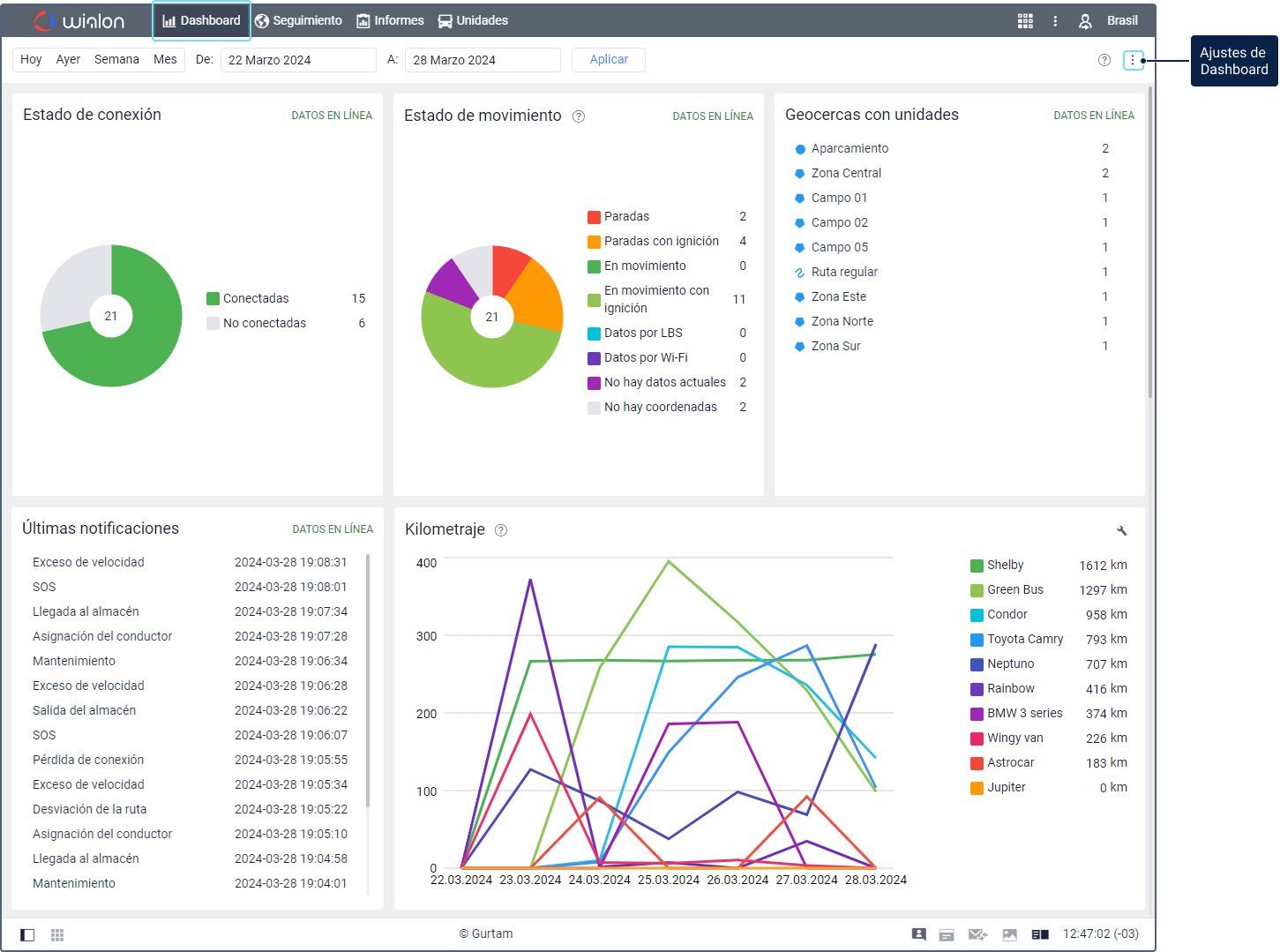 La pestaña Dashboard contiene información resumida sobre las unidades de la lista de trabajo. Aquí puede evaluar rápidamente el estado de dispositivos, conexión y movimiento de las unidades, ver las últimas notificaciones en línea y las geocercas donde están las unidades, etc. La información se actualiza a medida que llegan nuevos mensajes de las unidades.