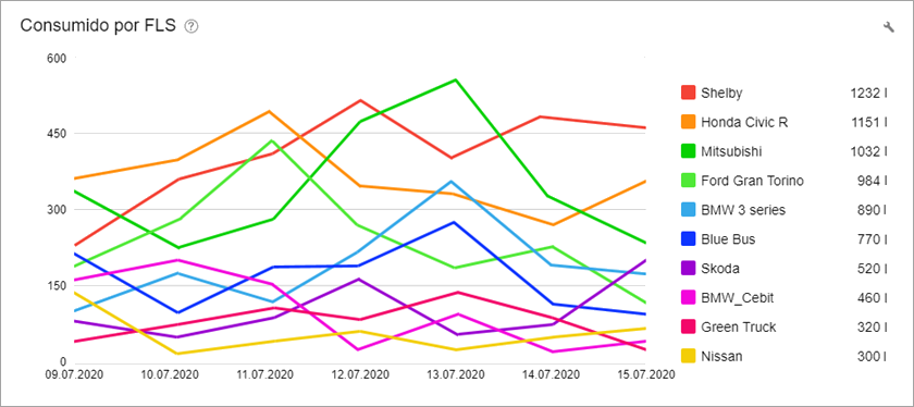 La gráfica en este bloque ofrece la información sobre el volumen del combustible consumido por las unidades y determinado por el sensor del nivel de combustible (FLS) en el intervalo indicado (por defecto, los últimos siete días). Si el intervalo es mayor que catorce días, los datos en la gráfica se agrupan. Si el intervalo es un día, se muestran puntos en vez de líneas.