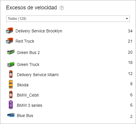 En este bloque se puede ver la lista de unidades para las que se han detectado excesos de velocidad en el intervalo indicado (por defecto, los últimos siete días). Al lado del nombre de una unidad se muestra la cantidad de todas sus infracciones. Para filtrarlas, elija el rango de valores necesario en la lista desplegable en la parte superior del bloque. Por ejemplo, se puede mostrar la cantidad de infracciones donde el exceso de velocidad equivale al rango de 10 km/h a 20 km/h.