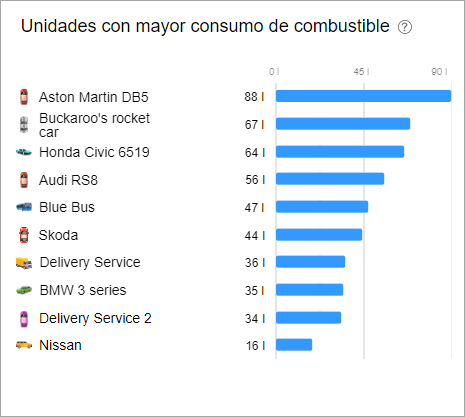 En el bloque se muestran las unidades con el mayor consumo de combustible determinado por el sensor del nivel de combustible en el intervalo indicado (por defecto, los últimos siete días). El volumen del combustible consumido por la unidad se indica al lado su nombre y se muestra adicionalmente en una gráfica horizontal a la derecha.