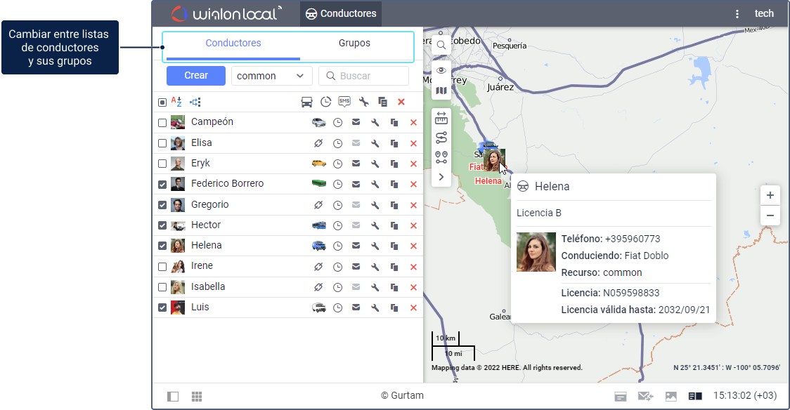 Para gestionar conductores, haga clic en la pestaña Conductores en la barra de herramientas superior o haga clic en el punto del mismo nombre en el personalizador del menú principal. Para gestionar grupos de conductores, active el modo Grupos.