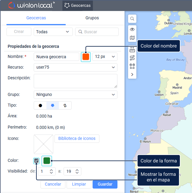 | Área | Área de geocerca. Se calcula automáticamente. El valor del área depende del sistema de medidas del recurso y puede indicarse en ha o mi² (ft²). |