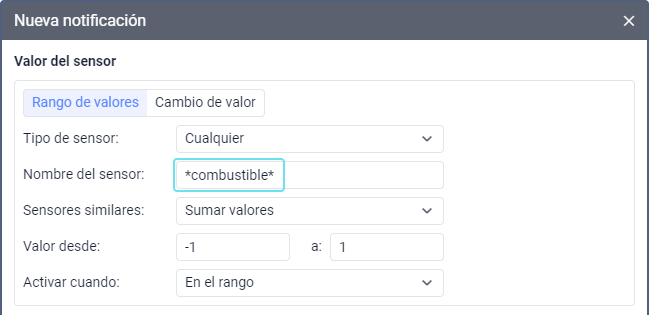 Por ejemplo, hay dos sensores de combustible que se llaman Sensor del nivel de combustible y Nivel de combustible en el depósito. Hay que crear una notificación que tome en cuenta estos dos sensores. Para ello, mientras configurar la notificación hay que introducir una máscara del nombre que corresponda a ambos sensores. En este caso puede ser *combustible*: