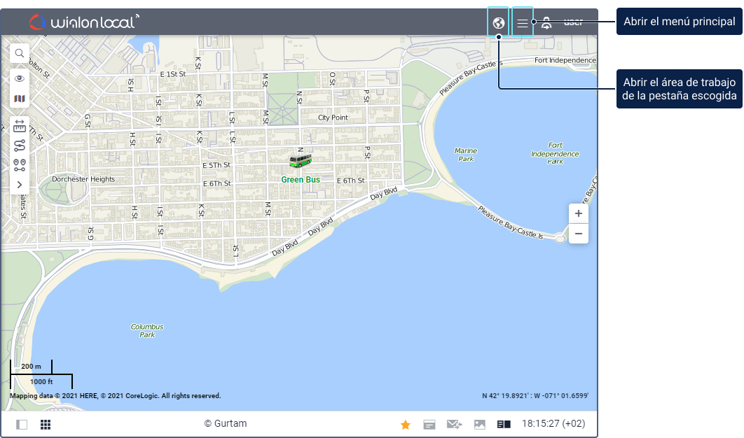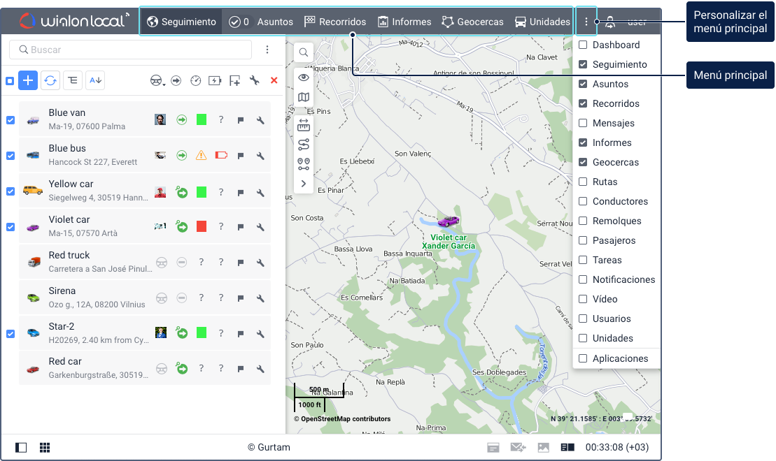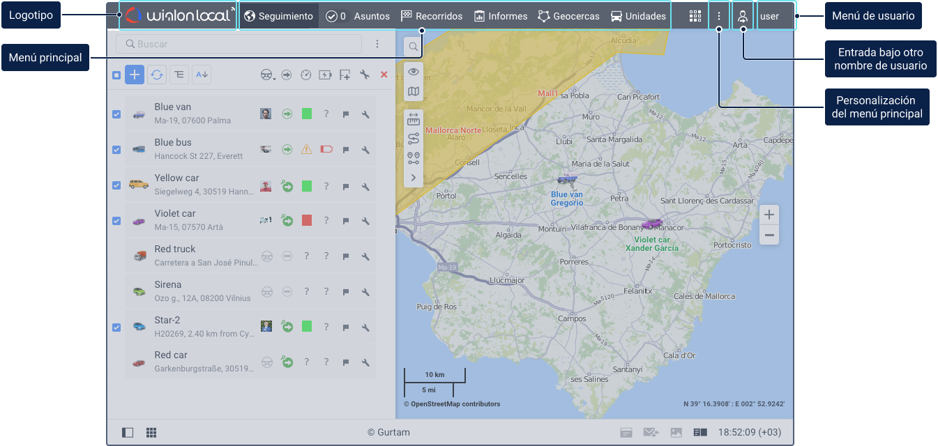 La barra superior del sistema de rastreo puede contener los siguientes elementos: