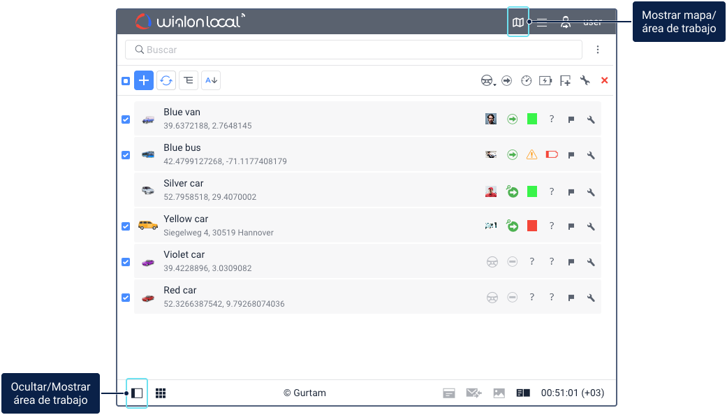 Si el ancho de la pantalla no permite mostrar el área de trabajo y el mapa al mismo tiempo, también puede utilizar el icono de la barra superior para cambiar entre ellos. El aspecto del icono depende de la pestaña abierta.