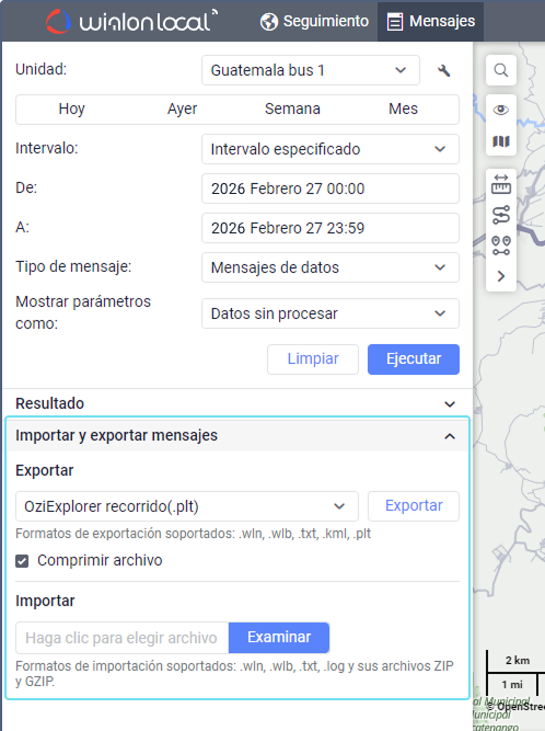 Wialon permite realizar la exportación/importación de mensajes. Solo se puede hacerlo con los mensajes del primer tipo, con los mensajes de datos.