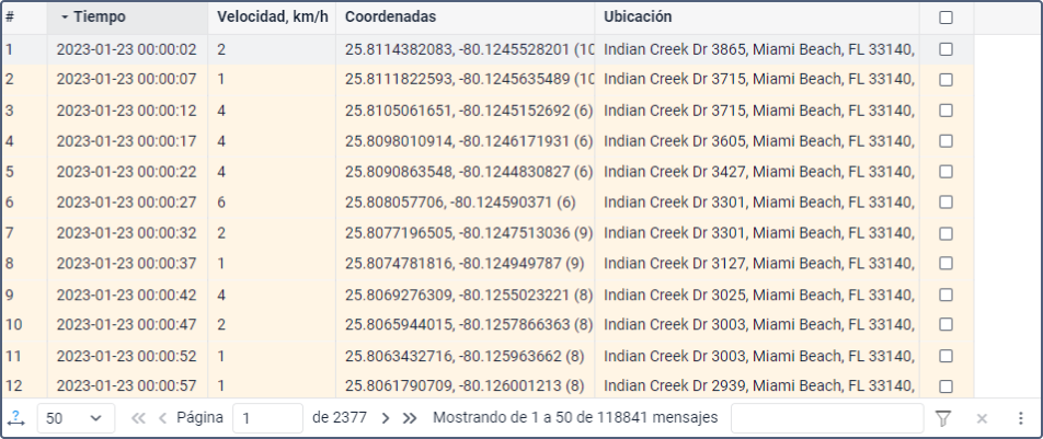 Al solicitar mensajes de datos importados, se muestran solo aquellos mensajes que se han añadido al historial de la unidad utilizando la importación. Para los mensajes de este tipo están disponibles las mismas funciones que para los mensajes de datos recibidos de la unidad. La única diferencia es que todas las líneas en la tabla de mensajes importados son de color naranja claro y la columna Hora de registro contiene rayas.