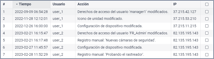 | IP | La dirección del ordenador, desde el cual ha introducido cambios el usuario. En esta columna puede haber apuntes del tipo tarea o notificación, que significan que una acción ha sido realizada por el sistema automáticamente. |