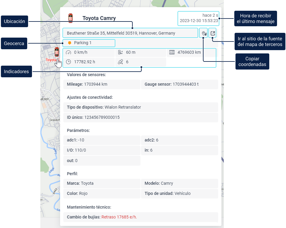 La información adicional puede incluir los siguientes puntos: la hora de recibir el último mensaje, ubicación de la unidad, distancia a la geocerca más cercana, presencia en geocercas, velocidad, altitud, contadores, cantidad de satélites, coordenadas, configuración de conexión, icono de unidad, valores de sensores, parámetros, conductores y remolques asignados, campos personalizados, intervalos de mantenimiento técnico.