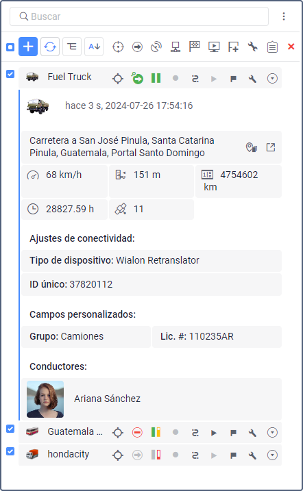 Este menú no tiene datos de ubicación, ni función de seguimiento de la unidad, ni el icono para eliminarla de la lista, aunque estén marcados en la pestaña Seguimiento.