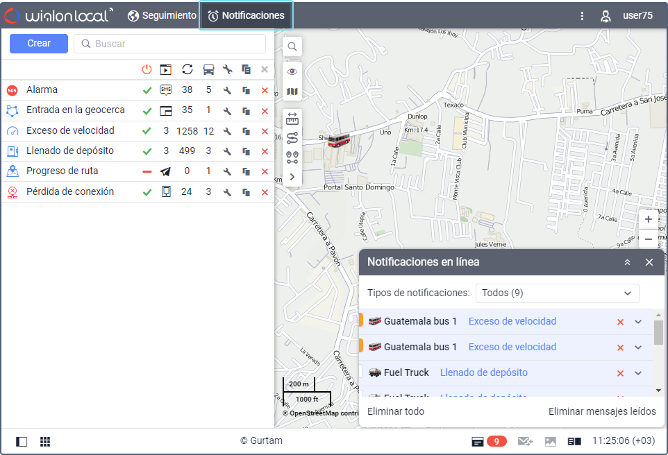 Con las notificaciones en el sistema de rastreo, puede controlar el cambio de posición de unidades, valores de sensores, asignación de conductores, remolques, etc. En caso de activarse la notificación, son posibles: