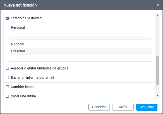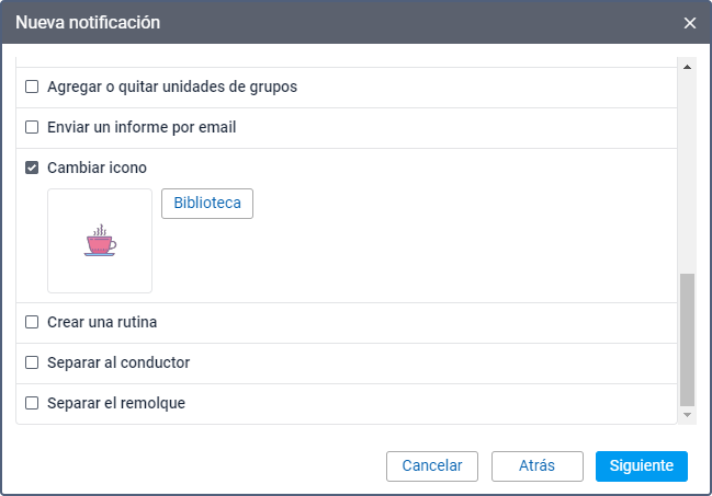 Este modo de acción permite escoger el icono que debe ser el icono de la unidad una vez activada la notificación. Para abrir la lista de iconos disponibles, apriete el botón Biblioteca.