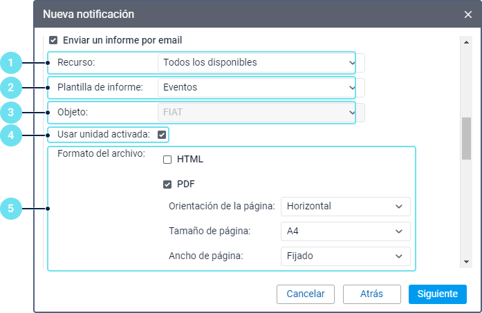 Si es necesario, active la opción Usar unidad activada. Está disponible solo para plantillas de informes por unidades o grupos de unidades. Si la opción está activada, el informe se ejecuta solo para aquella unidad que hace activarse la notificación, sin importar qué objeto se ha escogido en la lista anterior.