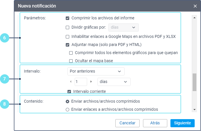 Algunos tipos de dispositivos permiten adjuntar al correo una imagen que fue enviada por la unidad en el mensaje al recibir el cual se activó la notificación. Para ello, active la opción Adjuntar imagen desde el mensaje.