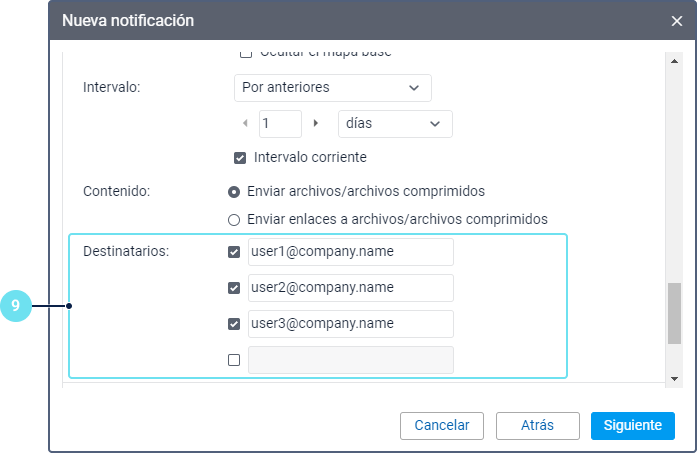 Indique y seleccione direcciones de correo electrónico de los destinatarios para recibir el informe. Al finalizar cada entrada, un nuevo campo se añade automáticamente.