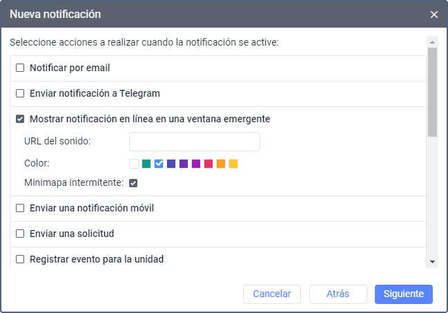 Este modo de acción permite mostrar notificaciones en una ventana emergente en Wialon (vea más detalles).