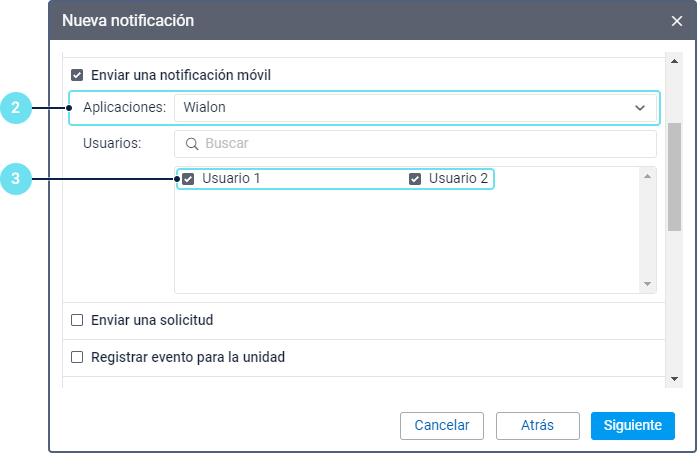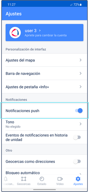 Asegúrese de que todos los usuarios que deben recibir notificaciones están autorizados en la aplicación móvil y la opción que permite recibir notificaciones está activada. En caso de Wialon para Android y iOS la opción Notificaciones push debe estar activada en los ajustes.