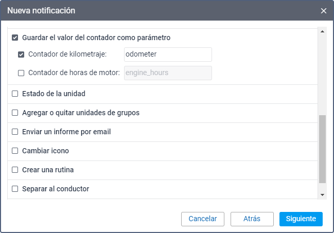 Este modo de acción permite guardar el valor actual del kilometraje (parámetro odometer) o de horas de motor (parámetro engine_hours) como parámetro en un mensaje. Esto es necesario para mostrar más tarde los valores inicial y final del kilometraje en un informe de viajes y transformar el parámetro engine_hours en el sensor de horas de motor y emplearlo más tarde. Para esto, se requiere el derecho de acceso Modificar contadores a la unidad.