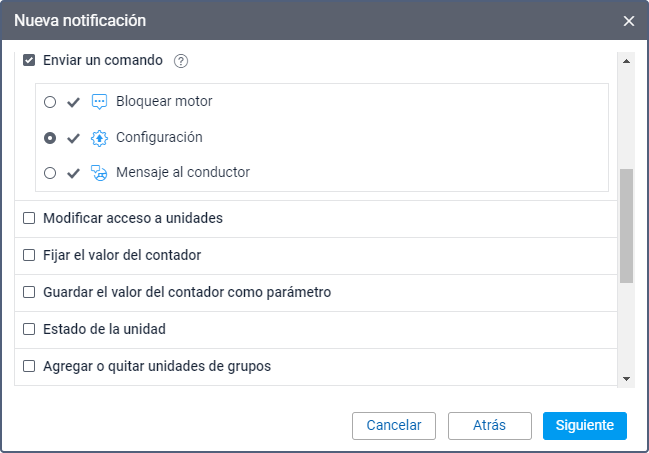 Este modo de acción permite enviar un comando determinado a una unidad (unidades). La lista contiene todos los comandos disponibles creados en las propiedades de todas las unidades seleccionadas si tiene el derecho de acceso Enviar comandos a estas unidades. A la izquierda del nombre de cada comando, se pueden mostrar los siguientes iconos: