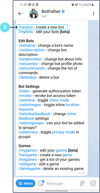 Seleccione el comando /newbot.