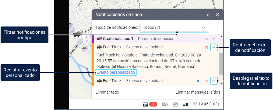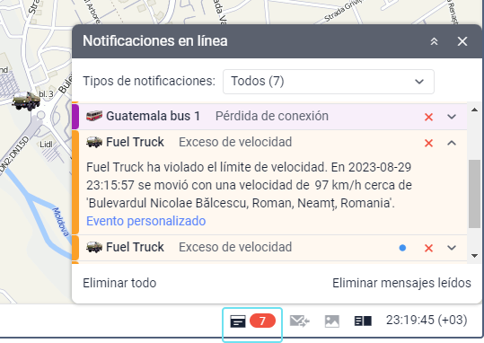 Al hacer clic en el título de la notificación, el mapa se centra en el lugar donde ha ocurrido el evento. Tras un clic en el nombre de la unidad, el mapa se centra en su ubicación. Además, la unidad se añade a la lista de trabajo de la pestaña Seguimiento y al mapa.