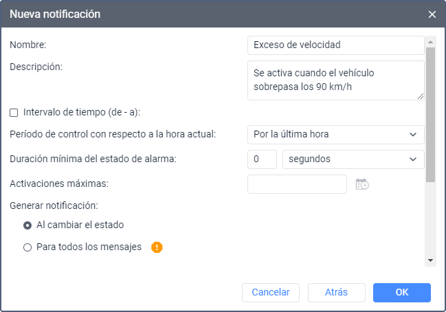 | Lapso máximo entre mensajes* | Lista desplegable en la que hay que escoger el tiempo máximo entre el mensaje de alarma y el mensaje anterior. Está disponible si para el parámetro Generar notificación está seleccionada la opción Al cambiar el estado. Si la diferencia de tiempo entre el mensaje de alarma y el mensaje anterior es mayor que la escogida, la notificación no se activa. |