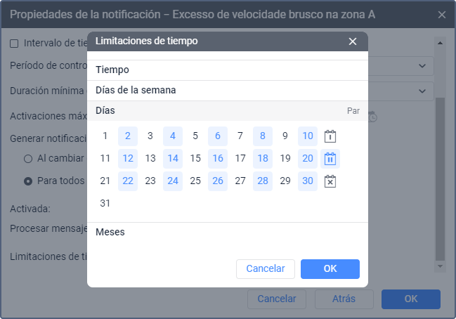 Para que los campos de intervalos se activen, coloque una marcas al lado de ellos.Días de la semana Seleccione días de la semana en los que deben controlarse los parámetros de la notificación. Días Seleccione días del mes en los que deben seguirse los parámetros de la notificación. Para seleccionar todas las fechas impares o pares a la vez, haga clic en el icono