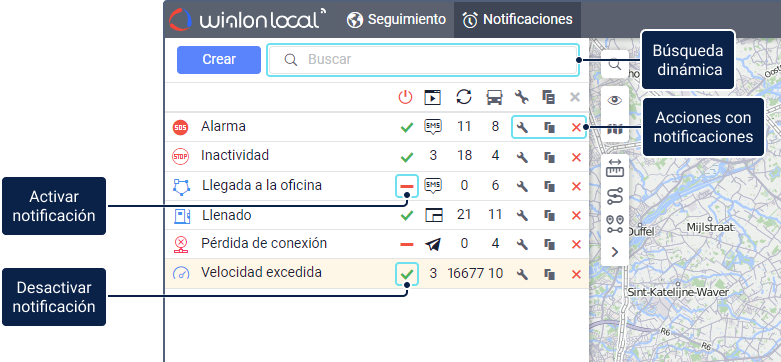 La pestaña contiene una lista de todas las notificaciones disponibles. Encima de la lista, se encuentran un botón para crear notificaciones y búsqueda dinámica por varios criterios.