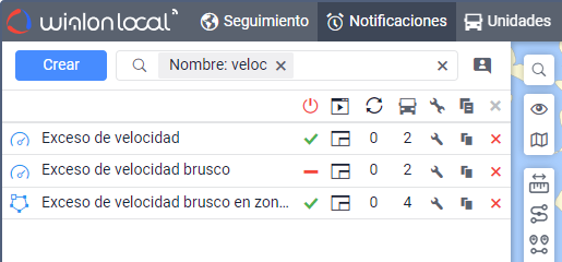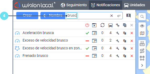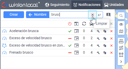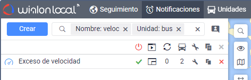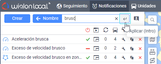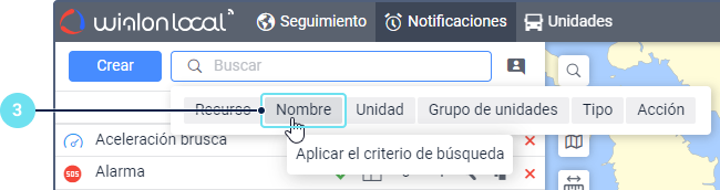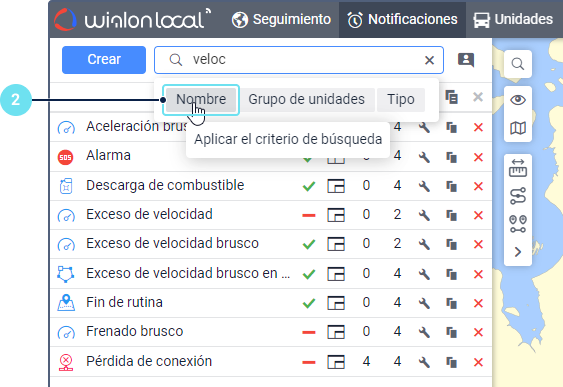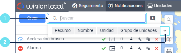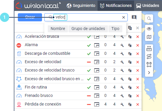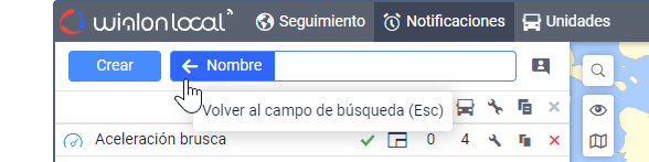Todos los criterios de búsqueda que correspondan a su consulta se muestran debajo del campo. Por ejemplo, si ha introducido veloc y tiene notificaciones con el nombre Exceso de velocidad, notificaciones del tipo Velocidad y notificaciones creadas para el grupo de unidades Vehículos veloces, los criterios Nombre, Tipo de notificación y Grupo de unidades se muestran debajo de su consulta. - Seleccione un criterio de búsqueda.
