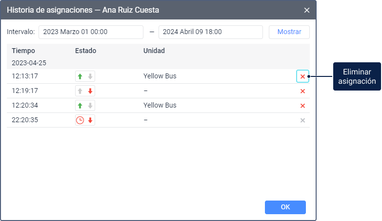 Para ver la historia de asignaciones, indique el intervalo necesario y apriete Mostrar. En la lista de asignaciones se muestran la fecha y hora de la asignación y separación, estado del pasajero y nombre de la unidad.