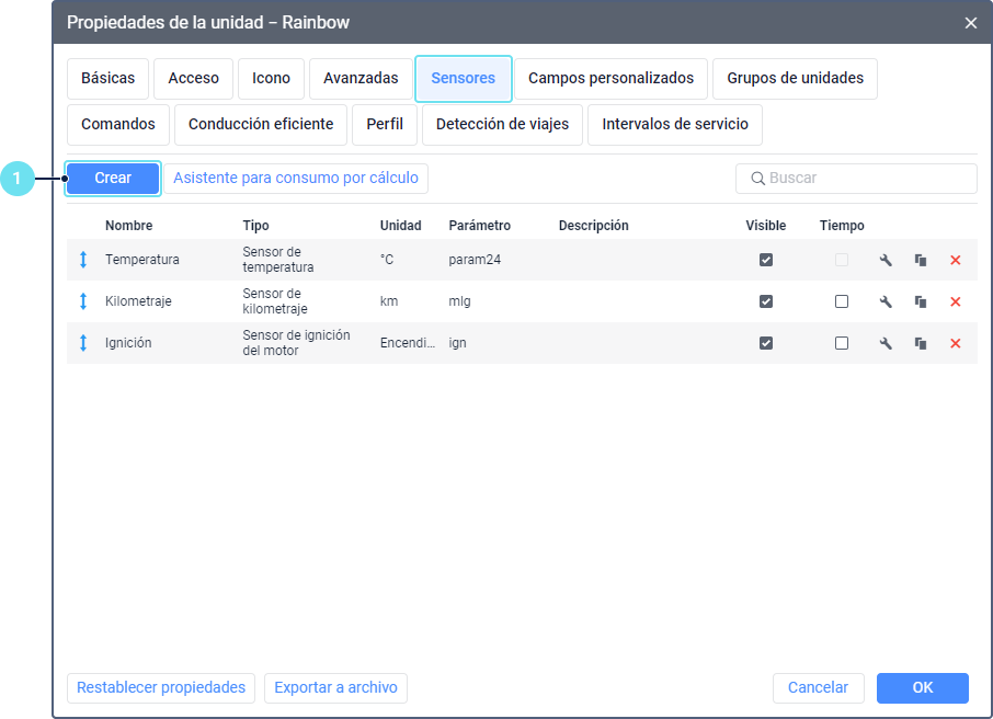 Para todas las unidades a las que quiere asignar automáticamente pasajeros cree un sensor de tipo Sensor de pasajeros. El parámetro depende del dispositivo utilizado y sus ajustes.