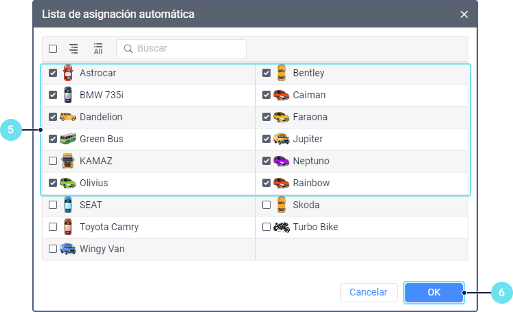 - Utilizar unidad en tareas, notificaciones, rutas, repetidores, a las unidades que deben utilizarse al asignar y separar pasajeros automáticamente.