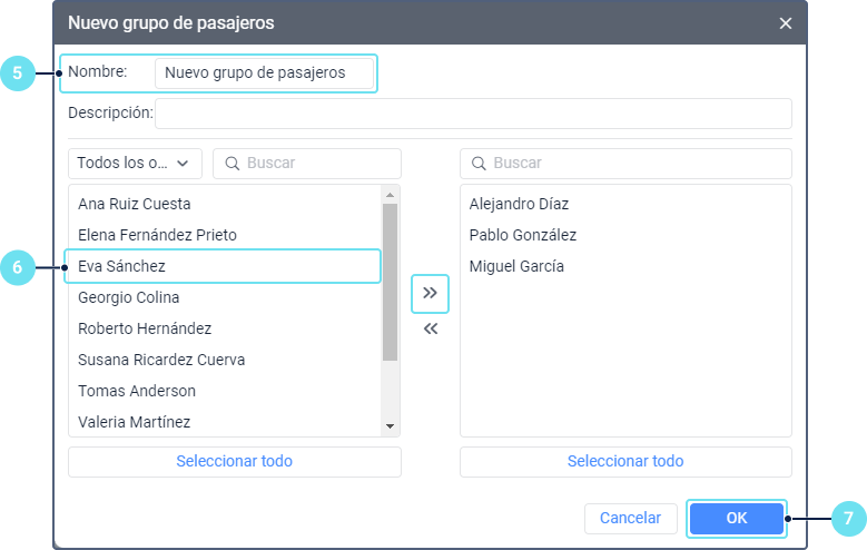 Escoja los pasajeros que deben formar parte del grupo. Para ello, seleccione los pasajeros en la lista izquierda y trasládelos a la lista derecha usando el icono