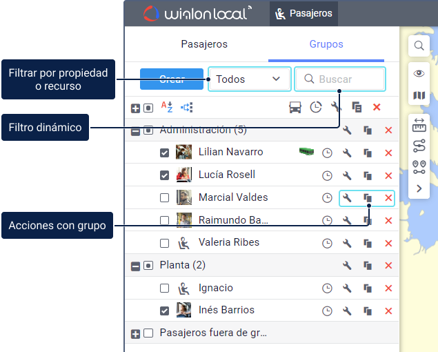 . Para facilitar la búsqueda del grupo necesario, emplee el filtro dinámico o filtro por propiedad (pasajeros asignados o no asignados) o por recurso.