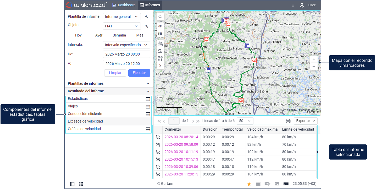 - Los informes pueden incluir los siguientes componentes: tablas, gráficas, estadísticas, un mapa con recorridos y marcadores de paradas, llenados de combustibles y otras acciones con la unidad señaladas en él.