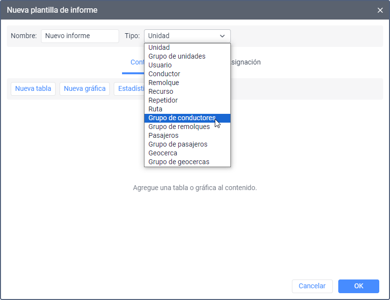 No pertenece a los informes avanzados la tabla Historial de los informes de tipos Grupo de unidades y Usuario.