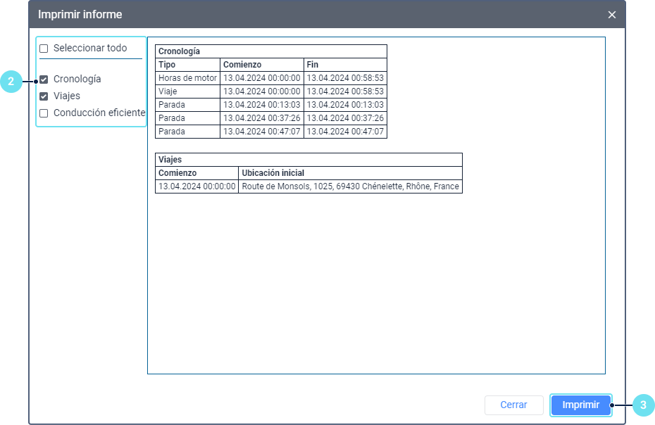 En la parte izquierda de la ventana, seleccione tablas, gráficas u otras secciones del informe que quiere imprimir. Para seleccionar todas las secciones, apriete Seleccionar todo. En la parte derecha, se muestra el contenido del informe.