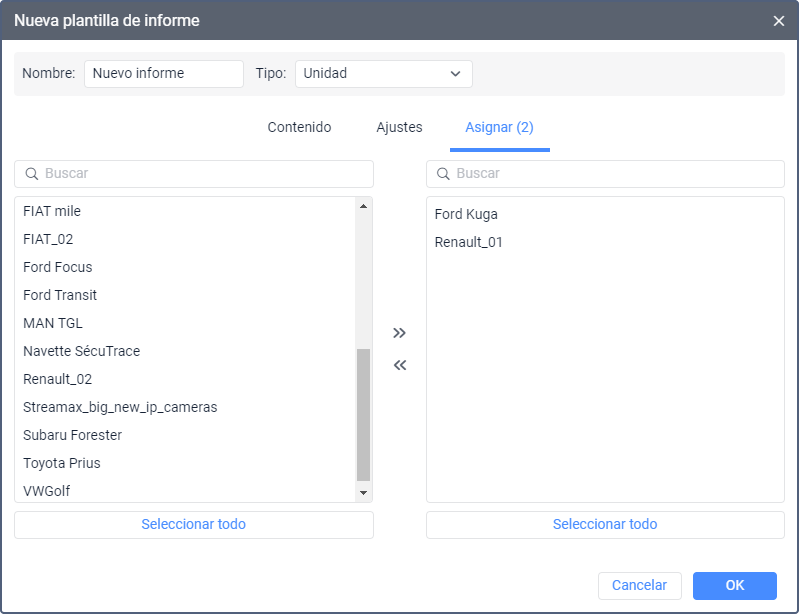 A una plantilla de informe, de acuerdo con su tipo, se puede asignar unos objetos del sistema concretos o sus grupos (para unidades, conductores, remolques y pasajeros). La asignación supone la restricción de la lista de objetos para los que se puede ejecutar el informe.