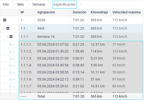 La especificación solo puede aplicarse a las tablas agrupadas. En otros casos no tiene sentido. Una exclusión son los informes por grupos de unidades, conductores, remolques y pasajeros, porque en ellos está prevista la agrupación por unidades por defecto.