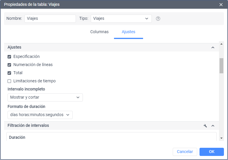 En las tablas donde hay duración elegir el formato de mostrarse esta. Las variantes posibles se describen a continuación.