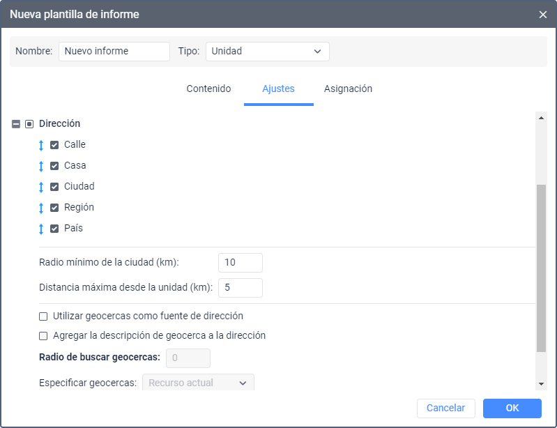 Una vez activada la opción Utilizar geocercas como fuente de dirección, se puede indicar una serie de parámetros adicionales. Por ejemplo, se puede agregar al nombre de una geocerca el campo de descripción (opción Agregar la descripción de geocerca a la dirección). En este caso, además del nombre de una geocerca, en el campo de dirección en el informe se muestra también la información del campo Descripción de las propiedades de esta geocerca. Para ver la distancia de la unidad a la geocerca, especifique el radio de buscar geocercas. El valor máximo permitido es de 100 kilómetros o millas (depende del sistema de medidas elegido).