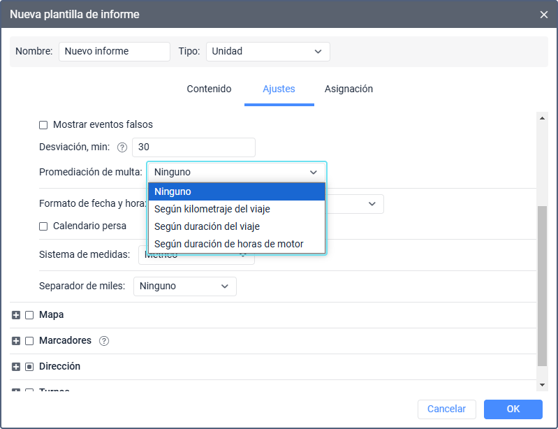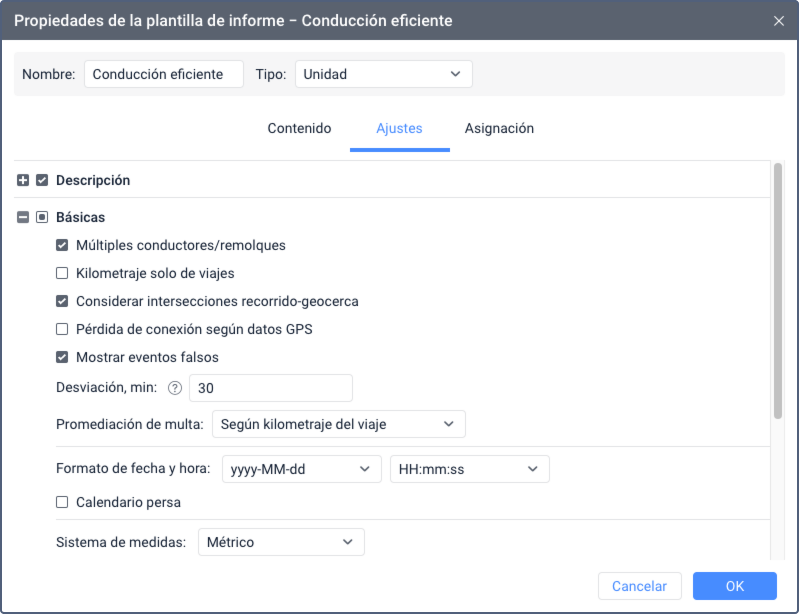 En la sección Básicos de los ajustes del informe se puede configurar el formato de fecha y hora, elegir el sistema de medidas y el separador de miles, así como activar algunas otras opciones cuya disponibilidad depende del tipo de informe.