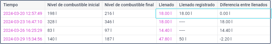 Si el mismo llenado de combustible fue detectado automáticamente por un sensor de combustible y registrado manualmente, en la tabla Llenados de combustible y recargas de batería los datos de volumen se muestran en una línea en las columnas Llenado y Llenado registrado respectivamente y se comparan entre sí.