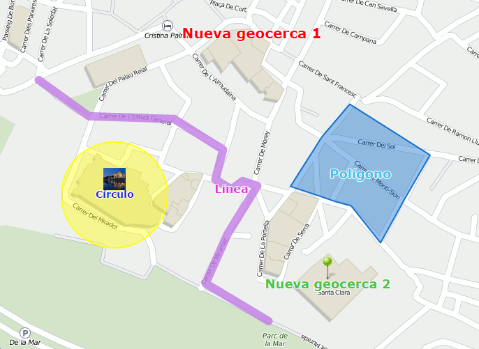 En caso de sobreponerse, las geocercas pueden mostrarse por un solo icono convencional cuya descripción emergente contiene información más detallada. Lo mismo atañe a los marcadores.