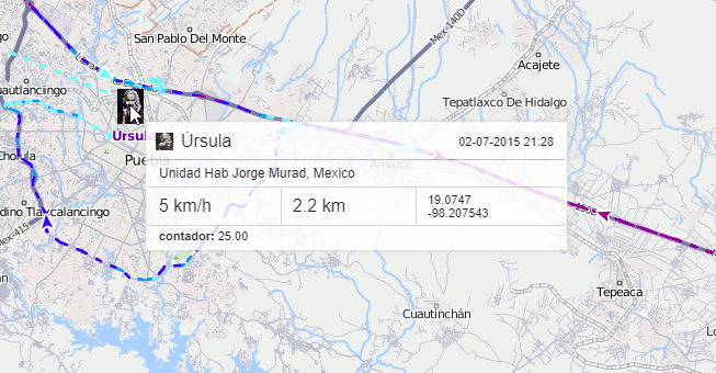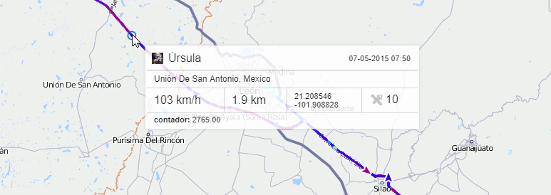 Al apuntarse al recorrido con el cursor del ratón, se realiza la búsqueda del punto más cercano de recepción del mensaje. Si hay tal punto en el radio de 50 píxeles, se muestra por un círculo palpitante azul y en la ventana emergente se escribe la siguiente información: la hora del mensaje, la velocidad del movimiento de la unidad en este punto, las coordenadas (más la cantidad de satélites entre paréntesis), la altitud sobre el nivel del mar y los valores de sensores. Cuando hace clic en coordenadas, se puede ir al mapa de la fuente de terceros. Vea más detalles aquí.