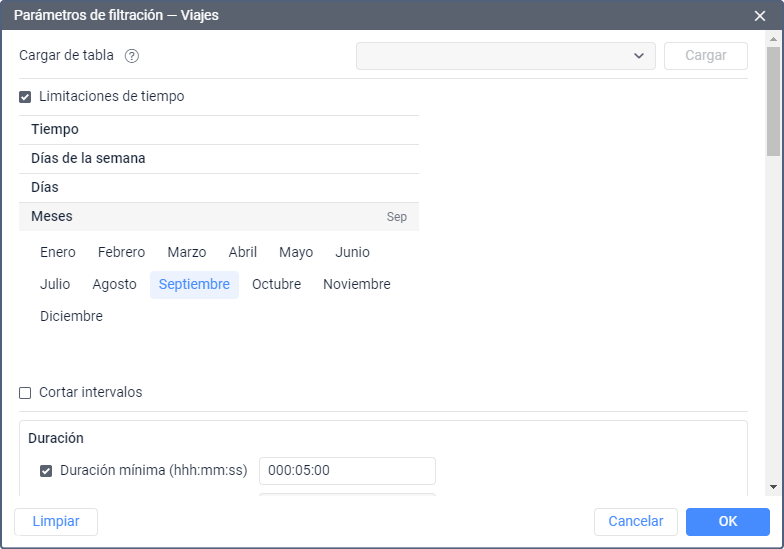 A algunos elementos gráficos (recorridos de viajes, marcadores de llenados, descargas, paradas, estacionamientos, excesos de velocidad, eventos) se les puede aplicar filtración igual que a las tablas. La filtración permite restringir el número de elementos gráficos que se muestran en el mapa de acuerdo con varios parámetros (tiempo, días de semana, turnos laborales, geocercas, etc.).